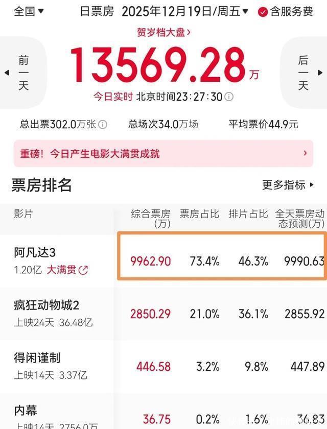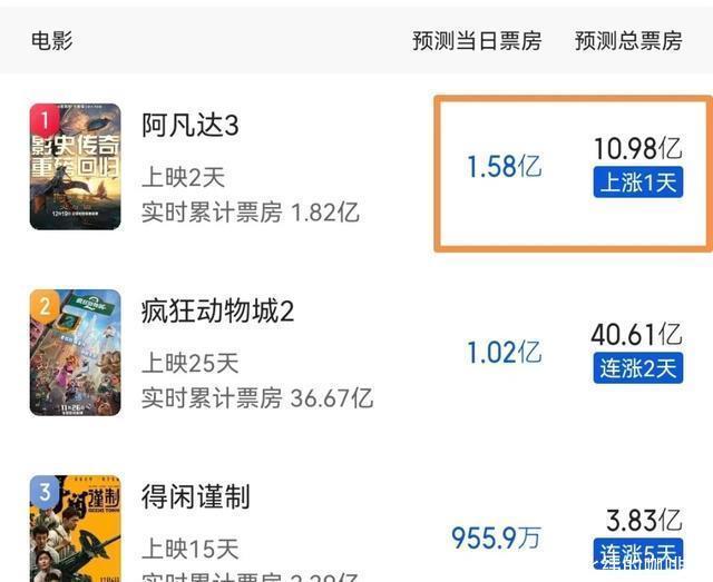 迪士尼动画《疯狂动物城2》 ,内地开画24天,日票房再次揽下2850万,其总票房已有36.47亿,《阿凡达3》来了,此片蝉联22个单日票房冠军也是时候该让贤了。 目前,此片为内地年度亚军,且片方申请了密钥延长至明年1月25日,尾部票房应该还有极强的吸金能力,其总票房有望冲击40亿。 《阿凡达3》夺冠,首映票房报收1.2亿 ,这是加了预售的成绩在里面,其实周五首日的票房仅为9900万,差一点就破亿了。